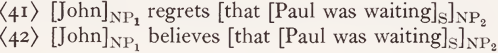 The reading of ‘regret ’ and ‘ believe ’ must contain, among other things, relational features representing a certain attitude of their first argument - the X1 provided by the NP1 ‘John’ in (41) and (42) - towards their second argument, provided by the complement ‘that Paul was waiting’.
