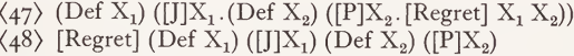 It follows from these remarks that a formal explication of the distinction in question and a suitable notation to represent it depends on several problems of semantic representations. Most of these problems are scarcely understood, to say nothing about their solution. If I nevertheless propose a tentative notation, it is only in order to facilitate some additional remarks. What any account of the problem in question must provide seems to be the following: given a proposition P, i.e. a well defined combination of delimiting and predicative features with suitable arguments, the name of the fact associated with P must be derivable. Using the notation proposed so far, we may write this name as ‘ (Def Xi) ([P]Xi)’.6 The way in which such a fact name provides the argument for an F-feature depends on whether alternative (i) or (ii) discussed above with respect to the operators (QXi) is accepted. Let P be the reading of ‘Paul was waiting’ and ‘(Def X1) ([J]X1)’ the reading of ‘John1’. Assume furthermore that the reading of ‘regrets’ consists only of the F-feature ‘Regret’, then we get (47) and (48), corresponding to (23) and (24) respectively, as the reading of (41):