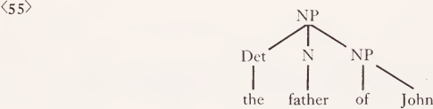 So far we have discussed problems of relational features occurring in the readings of verbs. These considerations apply directly to adjectives governing objects, e.g. ‘free’, ‘due’, etc., or complements, such as ‘eager’, ‘able’, etc. I will now touch briefly on relational features occurring in readings of relational nouns such as ‘father’, ‘friend’, ‘side’, ‘roof’, etc. Nouns of this type express social roles, the part-whole-relation, etc. Semantically the representation of such relations is straightforward, by means of such two-place predicates as ‘Parent’, ‘Part’, etc. The problem here is the syntactic index required for the variables in the lexical reading. Notice first of all that every noun must contain in its lexical reading a variable which is to be replaced by Xi, if the noun in question functions as the head noun of an NPi. This variable will be indexed for the relation ‘ Subject-of’, since it is precisely this variable which is to be substituted by the argument expression provided by the subject NP, if a noun is used in the predicate NP of a copula sentence. The question then is: what is the syntactic index of the second argument occurring in relational nouns? This question is directly related to the problem of the structure underlying such NPs as ‘John’s father’, ‘the left side of a chair’, etc. It has been assumed, at least implicitly, by many writers that possessive genitives should be derived from underlying relative clauses with ‘have’. T. his seems to me quite unnatural, however, in the case of inherent relations pertinent to relational nouns of the type discussed here. It seems more reasonable to assume that relational nouns ‘govern’ an object NP in much the same way as verbs and adjectives do. Thus the structure underlying ‘John’s father’ should be something like