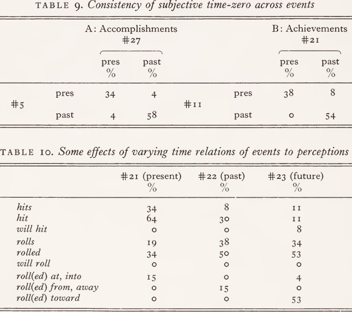 Using the ratio of present-to-past ‘sets’ for our speakers (approximately 40% present to 60% past), we can now ask to what extent the attempted manipulations of time orientation in events #21-23 were successful in producing deviations from this base-line. As shown in Table 10, the terminal achievement verb hit does show the predicted trends: #21 (present) has a present/past split at about the base-line; #22 (past) is biased more toward past tense (although the over-all frequency of hit goes down); and # 23 (future) shows much reduced past tense and 8% future. The interminal action verb roll shows much higher frequencies of occurrences for #22 (past) and #23 (future) - events for which contact between BALL and TUBE was not observed but much ‘ rolling ’ was - yet the ratio of present to past stays quite constant near the base-line level. Also shown in Table 10 are relative frequencies of certain prepositional phrases accompanying the verb rolled (in either present or past tense); rolling at or into occur when the event is seen, rolling from or away when it has already happened, and rolling toward when the event is anticipated. That the preposition toward carries a future orientation is evident from the 53% occurrences when the event is anticipated but not seen, and of these most were accompaniments of past-tense rolled. There appears to be semantic equivalence between will hit and rolled toward in expressing a future-orientation feature.