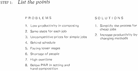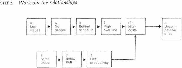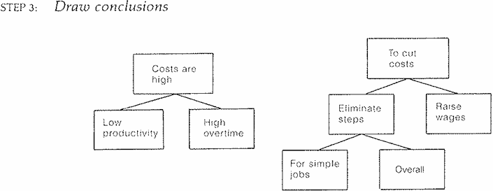 This analysis reveals two separate lines of reasoning, with the possibility that some points that should be made have been omitted. Now you're ready to draw some conclusions. Either he's saying that the costs are high because the productivity is low and the overtime is high, or he's saying that to cut the costs you have to simplify the methods and raise the wages.