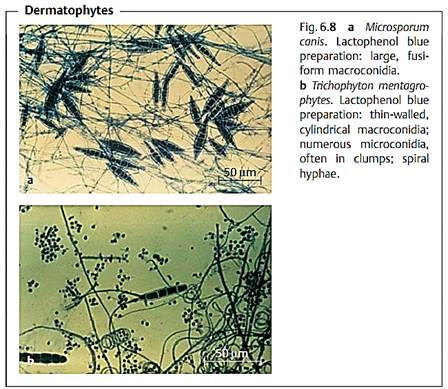 Morphology and culture. The dermatophytes are filamentous fungi. They grow readily on fungal nutrient mediums at 25-30 °C. After 5-14 days, cultures with a woolly appearance, in different colors, usually develop (Fig. 6.8).