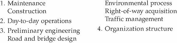 3. To review and analyze the areas of preliminary engineering, road and bridge design, environmental process, right-of-way acquisition and traffic management