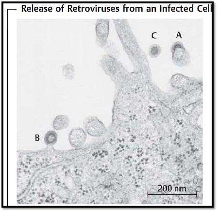 Fig. 1 Electron microscope image of release of viral progeny. The process takes place in the order, A, B, C.
