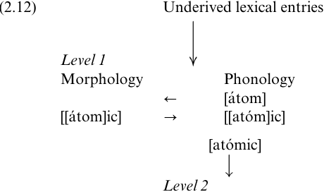 Allen (1978) observes that this interaction of morphology and phonology is not limited to the stress rules, and suggests that on each stratum a particular boundary will be assigned to structures derived on that stratum: the boundary will be + on Level 1, and # on Level 2. Phonological rules may then be formulated to apply across + but not #. Subsequently, Mohanan (1982) and Kiparsky (1982) translate these preliminary observations into a much more integrative model. The central assumption of LP is that each lexical level constitutes the domain of application for a subset of the phonological rules, as well as certain word-formation processes. The phonological rules do not apply between the morphological strata, as Siegel suggested, but are assigned to them. The output of every morphological operation is passed back through the phonological rules on that level; this builds cyclicity into the model, and allows for the progressive and parallel erection of phonological and morphological structure, as shown in (2.12).