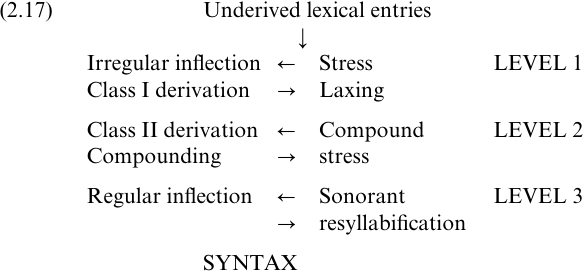 In the earliest versions of LP (Mohanan 1982, Kiparsky 1982) it was assumed that all lexical rules were cyclic, as shown in the model for English given in (2.17) (adapted from Kiparsky 1982: 5).