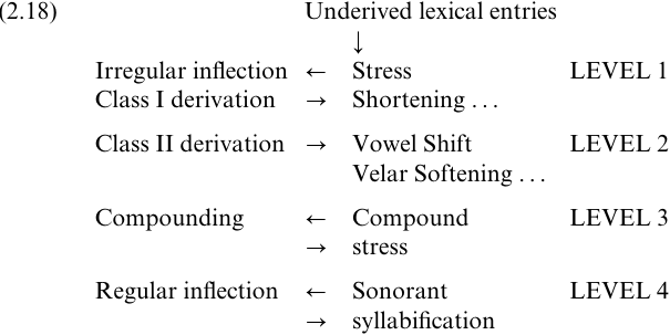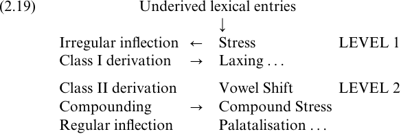 The lexical structure which Halle and Mohanan (1985) propose for English is shown in (2.18). There are four lexical levels; three are cyclic, but Level 2, the domain of Velar Softening and the Vowel Shift Rule, is non-cyclic. On cyclic strata, forms pass through the phonology, then to the morphology, and are resubmitted to the phonology after every morphological operation. On non-cyclic strata, however, all appropriate morphological rules apply first, and the derived form then passes through the phonological rules on that level once only.