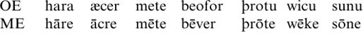 Middle English Open Syllable Lengthening (MEOSL) remains a controversial process, and one discussed in detail by Dobson (1962), Malsch and Fulcher (1975), Lieber (1979), Minkova (1982, 1985) and Ritt (1994); see also Hogg (1996), who argues that a regular but allophonic low-vowel Open Syllable Lengthening in Old English acted as `the first harbinger' (1996: 70) of MEOSL. It is beyond contention that all short vowels lengthened in the North, and [-high] short vowels in the South, in certain environments around the early thirteenth century; some examples are given in (1).