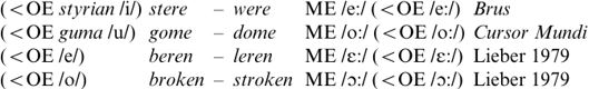 The question remains whether the innovation of [tense] preceded or followed MEOSL. There is some dialect and rhyme evidence for the persistence, at least initially, of two sets of long vowels, which one might see as lax and tense. For instance, in Yorkshire, Derbyshire, Lancashire, Staffordshire and other northern and north Midland areas of England, [ε:] and [ɔ:] from MEOSL have become Modern English [eɪ] and [oi], while older /ε:/ (<OE /æ:/) and /ɔ:/ (<OE /ɑ:/ and French loans) have developed to [iə] and [uə]. These facts suggest that `the reflexes of short vowels in open syllables and of original OE long vowels were still kept distinct in the Middle English dialect from which the modern north Midland and northern dialects derive' (Lieber 1979: 16). In terms of rhyme evidence, Dobson (1962) quotes a stanza from Troilus and Cryseyde, with rhyme scheme ABABBCC, which exhibits the rhymes shown in (6).