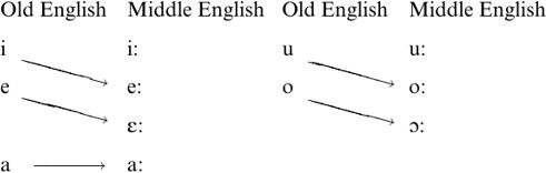 Some additional evidence for this proposed quality change comes from the Great Vowel Shift. If our usual assumptions about this sound change are correct, the relevant non-low vowels must have lowered before shifting (Malsch and Fulcher 1975). Week, for instance, surfaces in Modern English with [i:]; this is consistent with its having had an /e:/ vowel in Middle English, but not /i:/, which would have produced modern /aɪ/. Similarly, bear, with Modern English [e:]/[εə], must have had /ε:/ at the time of operation of the Great Vowel Shift; if Old English /e/ had simply lengthened to /e:/ in Middle English, one would expect Modern English *[bi:r] or *[bɪə] `bear'. The effects of MEOSL are schematised in (5).