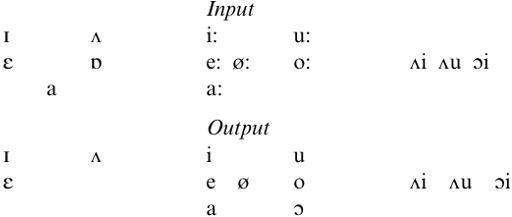 The output system in (4.21) also provides further support for the laxing and lowering of short vowels which was required above to account adequately for MEOSL. It is clear that the Modern Scots and SSE vowel system must include /ε a ɔ/, since each occurs in a fairly large set of lexical items (men, bed, slept for /ε/; cot, caught, pot, law for /ɔ/; and back, trap, car for /a/). In order to derive such a system historically, the short vowel system prior to the operation of SVLR cannot have been that of Old English, i.e. /i e a o u/, since the requisite length adjustments of SVLR would then have produced mergers of /i/ with /i:/, /u/ with /u:/, /e/ with /e:/, /o/ with /o:/ and /a/ with /a:/, and no source would be available for /ε/, while /ɔ/ would remain extremely marginal. We must rather assume a short lax vowel system /ɪ ε Λ ɒ a/, with /Λ/ having lowered from earlier /ʊ/ after GVS. Lass assumes that /a/ then merged with earlier /a:/ and /¡/ with earlier /ɔ:/, while /ε/ lengthened in the appropriate SVLR long environments, fitting into the same system as the originally long vowels as a new underlyingly short vowel with contextually long realizations. In fact, the status of /ε/ vis-à-vis SVLR is unclear; we shall also consider reasons for the exceptionality of /ɪ Λ/, which do not lengthen either synchronically or historically. As (4.21) shows, SVLR disrupted the correlation of length with [+ tense], and short with [-tense], which had held in English since around the time of MEOSL.