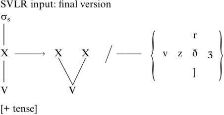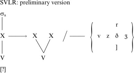 A working version of SVLR was given in vowels, and is repeated. Our main concern here is to replace the question mark in the input of the rule with an informative and motivated feature specification.