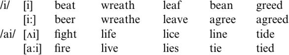 Giegerich (1992) points out one problem with the characterization of SVLR input vowels as tense: why should the tide, tied vowels be [+ tense], but the other diphthongs [- tense], when in general English diphthongs ally themselves with the long or lengthenable tense monophthongs? There is no real issue here for /ɔi/, which will be tense, but underlyingly long; and the same is true for /au/ in SSE and those Scots varieties where it surfaces consistently long. In cases where it is consistently surface short, I propose the underlier /Λu/, with a lax, unlength enable first element. As for [Λi]/[a:i], recall the proposal that the underlying form for the lengthenable diphthong should be /ai/, contrasting with the pay, way vowel /Λi/, which although restricted to final position, a long SVLR environment, is universally short.