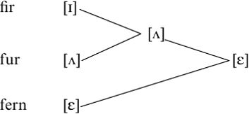 This dichotomy can be substantiated on synchronic and diachronic grounds. Synchronically, the evidence is primarily distributional: for instance, tense vowels may characteristically occur in stressed open syllables, and this holds for the [+ tense] Scots/SSE vowels ± bee, blue, bay, bow, law, baa have final /i u e o ɔ a/. However, although bit, but, bet are possible, *[bɪ], *[bΛ], *[bε] are not. /ε/ shows other behavioral and distributional affinities with /ɪ Λ ε̈/, as underlined by Dieth's (1932: 2) description of / ɪ Λ ε ε̈/ as `the phonetician's worry', since they are all interchangeable and hard to distinguish by ear. It is true that in careful speech, or when the items carry prominent or contrastive stress, many Scots speakers differentiate words like fir [fɪɹ], fur [fΛɹ] and fern [fεɹn]; but in more casual registers or under low stress, /ɪ/ and /Λ/ tend to fall together, and /ε/ often joins in too (see (3)).