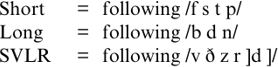 In my reanalysis, I grouped Agutter's contexts into three rather than her two groups, labelled short, long and SVLR environments in (1).