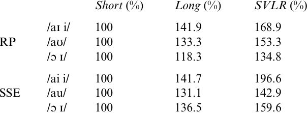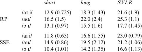 My assertion that this extra duration is due to SVLR might be challenged in view of the fact that /ɔ ɪ/, the supposed exceptions to SVLR, lengthen by 59.6% in SVLR over short contexts in SSE, but by only 34.8% in RP, with a similar extra increase for SSE of 24.8%. However, as the histogram in (5) makes clear, this discrepancy is due to the failure of RP /ɔ ɪ/ to lengthen by the expected amount in long contexts, while SSE /ɔ ɪ/ do follow the general pattern here. In both cases the difference between long and SVLR contexts is approximately 20%. Thus, the apparent extra lengthening for SSE /ɔ ɪ/ is actually due to differences in the behavior of the relevant vowels in long rather than in SVLR environments, and is probably an artefact of the experiment caused by the small number of informants in the RP class.