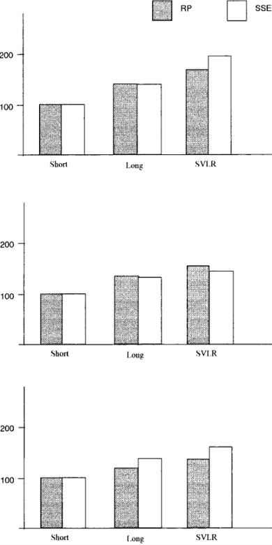 In (3), RP vowels are universally longer than those of SSE speakers, except for the SVLR vowels /ai i/ in SVLR contexts, where this relationship is reversed. This trend is confirmed by a second set of calculations, again based on Agutter's data. Although, for reasons given above, I did not weight these results, the figures in (4) do represent a certain amount of standardization. Here, the mean duration of each vowel group in short contexts is taken as the base, or 100 per cent, since no environmentally conditioned lengthening is assumed to be operating here. Vowel duration in long and SVLR environments is then expressed as a proportion of length in the short contexts. This assumption of a common base enables a comparison of like with like.