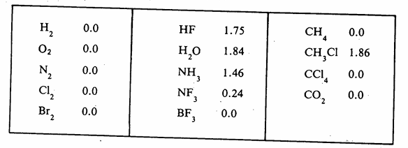 ويبين جدول (1 ـ 3) العزم القطبي لبعض الجزيئات، حيث أن العزم القطبي يدل على القطبية النسبية للجزيئات المختلفة.