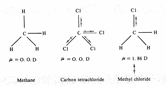 ان جزىء الميثان (CH4) ورابع كلوريد الكربون (CCI4) ليس لهما عزم قطبي بالرغم من أننا نتوقع على الأقل أن جزىء CCI4 قطبي لأن روابطه قطبية إلا أن تماثل الجزيء يؤدى إلى إلغاء قطبية الروابط أي أن محصلة قطبية الروابط تساوي صفر). أما في جزىء كلوريد الميثل (CH3Cl) فإن قطبية الرابطة بين الكربون. والكلور لا يلتغي، وبذلك يكون الجزىء قطبياً وقد وجد أن عزمه القطبي يساوى 1.86. لذلك فإن قطبية الجزىء لا تعتمد فقط على قطبية الروابط ولكنها تعتمد أيضاً على الشكل الذي يتخذه الجزىء.