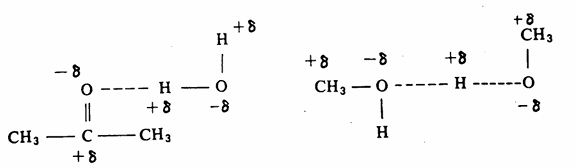 رابطة هيدروجينية بين جزيئين ميثانول، «رابطة هيدروجينية بين جزىء تزيد درجة غليانه لتجاذب الجزيئين مع ماء وجزىء أسيتون بالإضافة بعضهما بسبب الرابطة الهيدروجينية إلى قطبية كل من الجزئين مما بالإضافة إلى التجاذب الحاصل بسبب يسهل عملية ذوبان الأسيتون القطبية في الماء .