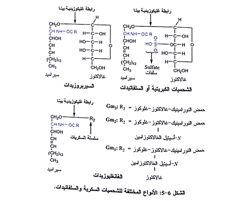 وهي أحد أصناف الشحميات المركبة (المعقدة)، وتتكون الشحميات التي تحوي جذراً سكرياً، وتتألف بنيتها الكيميائية من السيراميد الذي يرتبط إلى مجموعته الكحولية الأولية أحد السكريات أو سلسلة من السكريات برابطة غليكوزيدية بيتا β-glycosidic)). ولأنها تحتوي على السفنغوزين، فهي تدعى مع السفنغوميلينات (أحد أنواع الشحميات الفوسفورية) باسم الشحميات السفينغوزية sphingolipids. توجد هذه الشحميات المركبة بشكل رئيس في الوريقة الخارجية للأغشية الخلوية، وأكثر الأنسجة غني بما هو النسيج العصبي. وهي تشكل مستحلباً في الوسط المائي وتذوب في المذيبات غير القطبية ولكن ليس في إيثر البتروليوم. أما أهم الشحميات السكرية (الشكل 6-5) فهي: 1