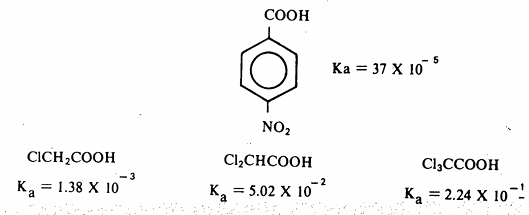 والعكس فإن إدخال مجموعات ساحبة للالكترونات بدلاً من المجموعات الألكيلية فإن هذا يؤدي إلى ازدياد في قوة الحموضة للمركبات الناتجة بسبب التأثير التحريضي لهذه المجموعات وبقدر ما يزداد عدد هذه المجموعات فإن صدى هذا التأثير يكون أقوى كما يتضح من الأمثلة التالية :