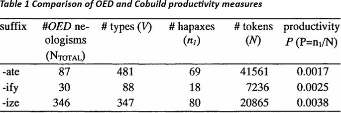 In the OED data, the ratio of -ify neologisms to -ate neologisms is somewhat higher than the ratio of the respective Cobuild hapaxes (0.34 vs. 0.26), which is explained by the fact that the number of -ate hapaxes in eludes fewer neologisms. The almost identical ranking of -ify and -ate in the dictionary-based count on the one hand, and in terms of V and P* on the other is therefore strong evidence for the accuracy and versatility of the OED data.