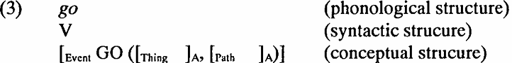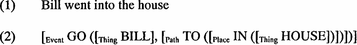 GO is a two-place function that maps a Thing (here: 'Bill') and a Path (here: 'to the interior of the house') into an Event consisting of the Thing traversing the Path (the expressions BILL and HOUSE are not decomposed for the present purposes). The entire expression in (2) can be read as "Bill traverses a path that terminates at the interior of the house". The lexical entry of the verb go can (roughly) be represented in this theory as in (3):