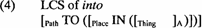 The subscript A indicates the argument status of Thing and Path for the function GO. Such arguments must be expressed by a syntactic argument, with the linking of conceptual arguments to syntactic arguments being done by general principles of linking, which need not concern us here any further (see Jackendoff 1990: chapter 11 for discussion). Thus, in a sentence like (1) the empty argument slots in the lexical conceptual structure (LCS) of go are filled by the appropriate arguments [Bill] and [into the house]. The preposition into (with its complement [the house]) provides an appropriate Path argument for the function GO because the LCS of this preposition is a Path, and [the house] is an appropriate argument for the function IN, which is also part of the LCS of into. Consider (4):