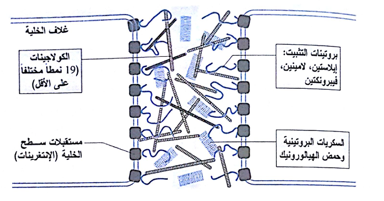 شكل (1) تمثيل مبسط لتآثر المكونات الأبرز للمطرس خارج الخلوي فيما بينها ومع الخلايا المجاورة .