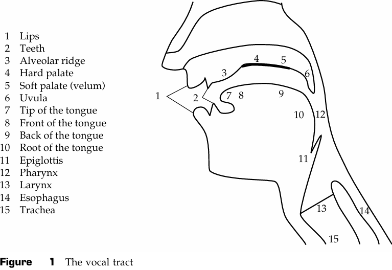 Our examination of how sounds are made will begin with the vocal organs. The air we use in sound production comes from the lungs, proceeds through the larynx where the vocal cords are situated, and then is shaped into specific sounds at the vocal tract. In sound production, it is generally the case that the articulators from the lower surface of the vocal tract (lower articulators, i.e. the lower lip, the lower teeth, and the tongue) move toward those that form the upper surface (upper articulators, i.e. the upper lip, the upper teeth, the upper surface of the mouth, and the pharyngeal wall).