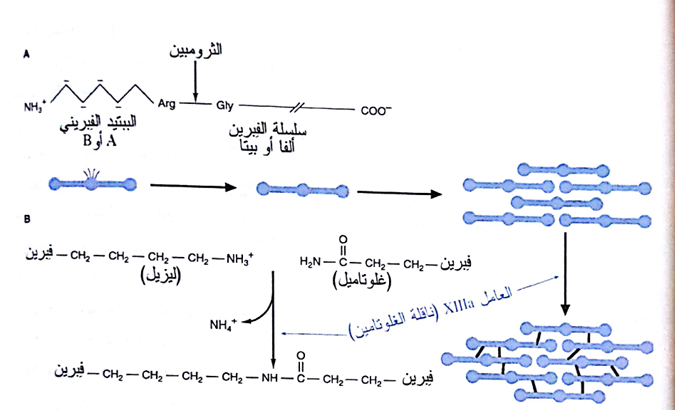 شكل (3) تشكيل خثرة الفبرين A: الشطر المُحرض بالثرومبين لروابط Arg-Gly في سلاسل الفبرين لتشكيل الببتيدات الفبرينية (يسار) والسلاسل ألفا وبيتا لموحودات الفبرين (يمين). B: الربط التصالبي لموحودات الفبرين بتواسط العامل XIII المفعل (XIIIa).