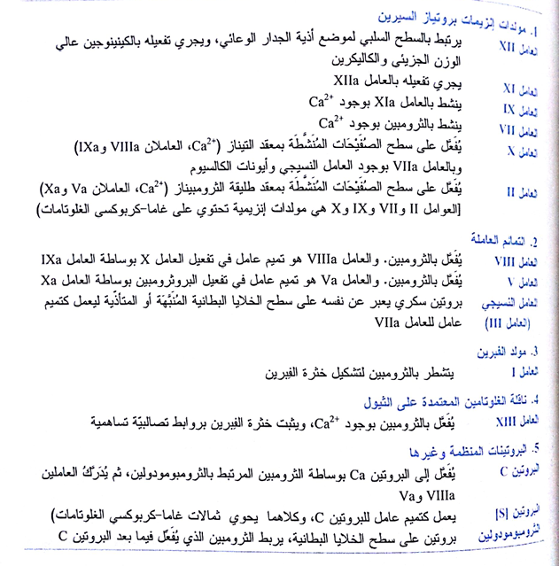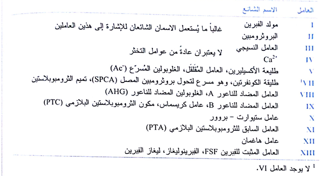 جدول (1) النظام الرقمي لتسميات عوامل التخثر ، وتشير الأرقام الى ترتيب اكتشافها زمنياً وليس الى الترتيب الذي تعمل به