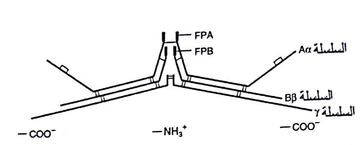 الشكل 2: تمثيل تخطيطي لبنية مولد الفبرين. لاحظ أزواج السلاسل الثلاثة المرتبطة بروابط ثنائية السلفيد و الببتيدات الفبرينية FPA) A) و B ) FPB) .