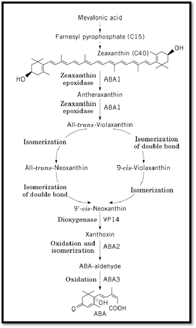 Figure 1. ABA biosynthesis in higher plants. Steps mediated by ABA1, ABA2, and ABA3 in Arabidopsis and by VP14 in Zea mays are indicated.