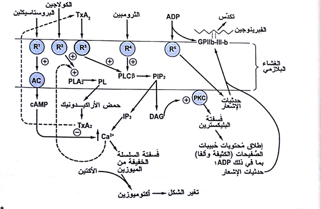 ( GP: بروتين سكري؛ R5-R1: مستقبلات ؛ AC: مُحلّقة الأدينيليل؛ :PLA2: الفسفوليباز A2 ؛ :PLشحمیات فسفورية ؛ :PLCβ الفسفوليباز -4,5:PIP2, Cβ ثنائي فسفات فسفاتيديل الإينوزيتول؛ cAMP: أحادي فسفات الأدينوزين الحلقي؛ PKC كيناز البروتين TXA2, C :الثرومبوكسان A2 :IP3 1،4،5-ثلاثي فسفات الإينوزيتول؛ DAG: ثنائي أسيل الغليسيرول؛ تشارك البروتينات المعتمدة على GTP، أو البروتينات G ، في العمليات لكنها لا تظهر في الشكل)