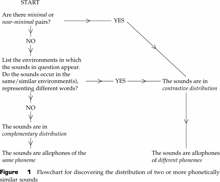 To sum up what has been reviewed so far, we can state that two or more phonetically similar sounds may have a different phonemic (functional) status in different languages. Their status is determined solely by their distribution in a given sound system. If they are in overlapping distribution (that is, can occur in the same environment, which can be verified via existence of a minimal or near-minimal pair), and the substitution of one for the other results in a change of meaning, then these two or more sounds are in contrast and are phonetic manifestations of different phonemes (for example, day [de] and they [ðe] reveal that [d] and [ð] belong to separate phonemes, /d/ and /ð/ respectively). When two sounds are in contrast (i.e. when the difference is phonemic), the speakers of that language develop a high-grade sensitivity toward that difference, and notice any failure to observe it.