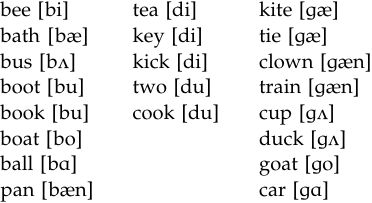 We can see that the child has the contrast between the bilabial and alveolar voiced stops, as revealed by bee [bi] versus tea [di]. On the other hand, we do not have a contrast between the alveolar and the velar. What we gather from the productions is that the client shows a case of complementary distribution between these two; [d] appears before high vowels (second column), and [g] appears before non-high (low or mid) vowels (third column). Once again, we have a situation in which the initially chaotic-looking productions that present mismatches with the ambient language have systematic patterns that could be exploited in therapy.