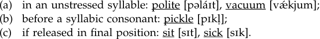 Finally, mention should be made of the glottal stop or the preglottalized /t/ and the contexts in which it manifests itself. A glottal stop is the sound that occurs when the vocal cords are held tightly together. In most speakers of American and British English (AE, BE), glottal stops or the preglottalized /t/ are commonly found as allophones of /t/ in words such as Batman [bæʔmæn], Hitler [hɪʔlɚ], atlas [æʔləs], Atlanta [əʔlæntə], he hit me [hihɪʔmi], eat well [iʔwεl], hot water [hɑʔwɑɾɚ]. While the glottal stop can replace the /t/ in these words, it is not allowed in atrocious [ətɹ̣oʃəs] (not *[əʔɹ̣oʃəs]), attraction [ətɹ̣ækʃən] (not *[əʔɹ̣ækʃən]; the asterisk here means “wrong” or “unattested”). The reason for this is that the glottal stop replacement requires the target /t/ to be in a syllable-final position ([bæʔ.mæn], [əʔ.læn.tə]). The words that do not allow the replacement have their /t/ in the onset position ([ə.tɹ̣o.ʃəs], [ə.tɹ̣ æk.ʃən]), as /tɹ̣/ is a permissible onset in English. We should point out, however, that /t ɹ̣ / being permissible is not carried over across words, as the compound court-room illustrates. The expected production of this sequence is with a glottal replacement, [kɔɹ̣ʔrum], because the syllabification is not [kɔɹ̣.tɹ̣um]. The glottal stop replacement of syllable-final /t/ is also observable before syllabic nasals (e.g. beaten [biʔn̩], kitten [kɪʔn̩]). The process under discussion is most easily perceived after short vowels (e.g. put, hit), and least obvious after consonants (e.g. belt, sent). As pointed out above, in absolute final position, some speakers do not replace the /t/ with a glottal stop entirely, but insert a glottal stop before /t/, as in hit [hɪʔt] (‘preglottalization’ or ‘glottal reinforcement’). The only difference between a glottal stop and a glottally reinforced [ʔt] is that the tip of the tongue makes contact with the alveolar ridge in the latter case but not in the former. It is also worth pointing out that this glottal reinforcement may be applicable to other voiceless stops for many speakers, as shown in tap [tæʔp], sack [sæʔk].