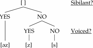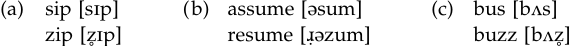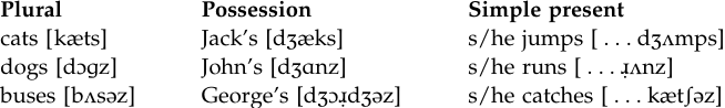 A subgroup of fricatives (alveolars, /s, z/, and palato-alveolars /ʃ,Ʒ/), that are known as ‘sibilants’ are very important for certain regularities in English phonology. These fricatives are produced with a narrow longitudinal groove on the upper surface of the tongue; acoustically, they are identified by noise of relatively high intensity (hissing, hushing noise). In the formation of the regular noun plurals, third person possessive marking, and marking of the third person verb ending in the simple present, sibilants play an important role. In all these events, English has three possible markings, [s], [z], and [əz], as shown in the following: