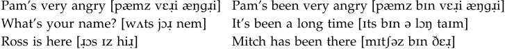 All the above can be accounted for by stating one rule: if the last sound of the singular noun (in the left column), possessor (in the middle column), or verb (in the right column) is a sibilant (affricates /ʧ/ and /ʤ/ are sibilants because they have in them the sibilant fricatives /ʃ/ and /Ʒ/ respectively), then the ending is [əz]; if the last sound is not a sibilant, then the ending is either a [s] or a [z], and this is determined by its voicing. This pattern repeats itself in the contractions with “is” and “has” in connected speech.