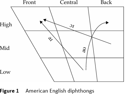 The three diphthongs of American English, /aɪ, aʊ, ɔɪ/, given in figure 1, can appear in all word positions, are all stressed on the first vowel, and all end in a high vowel. While the end points are pretty well established across the varieties of American English, the first element of these diphthongs may show considerable variation.