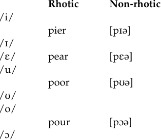Besides these diphthongs, in non-rhotic varieties (eastern New England, New York City, lower South), the targets with V + /ɹ̣/ turn into centering diphthongs. Thus, we have the following correspondences:
