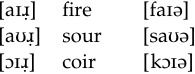 In the case of [ɑɹ̣], we get a prolonged [ɑ:] rather than [ɑə] (e.g. car [kɑ:]). The remaining three diphthongs show the following centralizations: