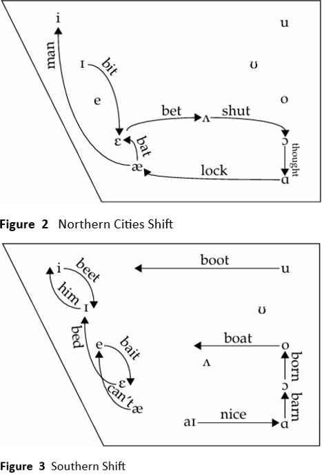 Northern Cities Shift is seen in western New England, New York State, northern Pennsylvania, northern Ohio, Illinois, Michigan, and Wisconsin. A more advanced form of this shift is mainly concentrated in the larger metropolitan areas (Syracuse, Buffalo, Cleveland, Toledo, Detroit, Chicago, Madison). This shift, which is a clockwise rotation, is shown in figure 2.