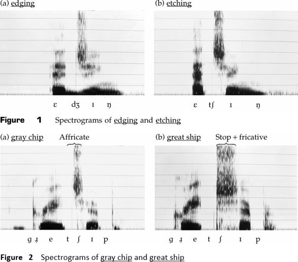 We stated that affricates, although phonetically a combination of a stop and a fricative, function as single units in the sound system of English. The combined duration of an affricate is shorter than the duration of the corresponding stop plus the fricative. This difference can be seen in the spectrograms of gray chip [gɹ̣e tʃɪp] vs. great ship [gɹ̣et ʃɪp] given in figure 2.