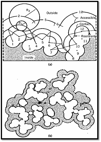 The surfaces of folded macromolecules, especially proteins, and the internal packing of their atoms have generally been analyzed using the procedure of Lee and Richards (1). The cross section of part of the surface of a native protein is depicted in Figure 1, which demonstrates a number of different surfaces and volumes (see Protein Structure). The van der Waals surface is defined by the spherical atoms that comprise the structure, but it is not very relevant to a folded macromolecule like a protein, where internal atoms and cavities are normally inaccessible to the solvent.