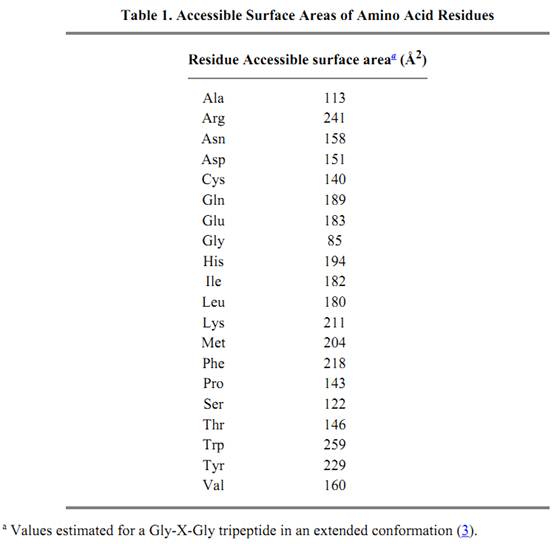 The structures of protein determined by X-ray crystallography indicate that the total accessible surface area As of a protein is approximately proportional to the two-third power of its molecular weight. The As (in Å2) of a typical small monomeric protein is usually related to its molecular weight Mw by the approximate relationship (2)