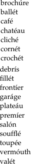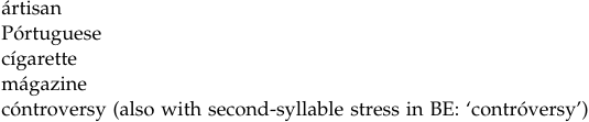 (a) The first group consists of two-syllable nouns of French origin. These words are stressed on the final syllable in American English (AE), while they receive the stress on the first (penult) syllable in British English (BE):