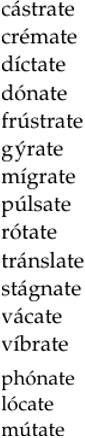 However, in confláte, creáte, debáte, defláte, eláte, reláte, abáte, infláte, negáte, AE, like BE, places the stress on the final syllable.
